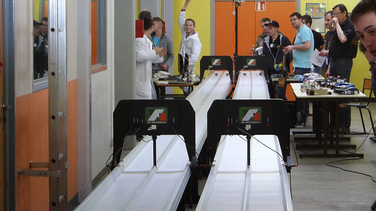 Une fois le stand en place, la pression a grimpé peu à peu au sein de l’équipe. Les essais sur piste (une ligne droite de 15 mètres) ont permis de vérifier à nouveau que la voiture tenait la route, et qu’elle était capable de parcourir la distance en un temps très correct (2,8 secondes). Durant la matinée, l’équipe a présenté sa soutenance au jury. Huit minutes au total, dont une intégralement en anglais, durant lesquelles ont été présentés le projet, la démarche adoptée, les matériaux composant la voiture, le scénario, ainsi que la vidéo créée par l’équipe en fil rouge du projet. Les cinq Crazy Docs ont ensuite enchaîné avec la présentation du stand.